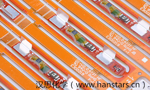 在手機(jī)電池保護(hù)板芯片底部填充及封裝應(yīng)用方面,漢思化學(xué)研制的低粘度的底部填充膠,是一種單組份、快速固化的改性環(huán)氧膠粘劑,可靠性高、流動性大、快速填充、易返修,用于BGA、CSP和Flip chip底部填充制程,利用加熱固化形式,將BGA底部空隙大面積填滿(填充飽滿度達(dá)到95%以上),有效降低由于硅芯片與基板之間的總體溫度膨脹特性不匹配或外力造成的沖擊,提高芯片連接后的機(jī)械結(jié)構(gòu)強(qiáng)度,增強(qiáng)BGA封裝模式芯片和PCBA間的抗跌落性能。