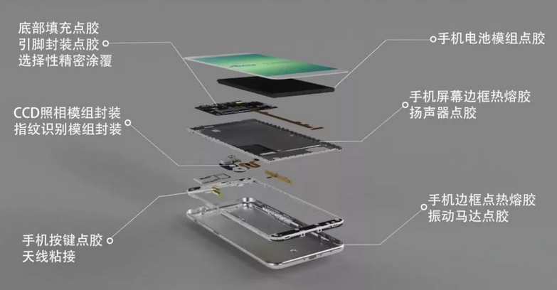 事實上,電子膠粘劑一直以來都在電子電器、汽車、軌道交通、航天航空、軍工等工業(yè)制造領(lǐng)域發(fā)揮意想不到的驚人作用和舉足輕重的價值。就智能手機而言,其主要膠水應用主要要以下幾種: