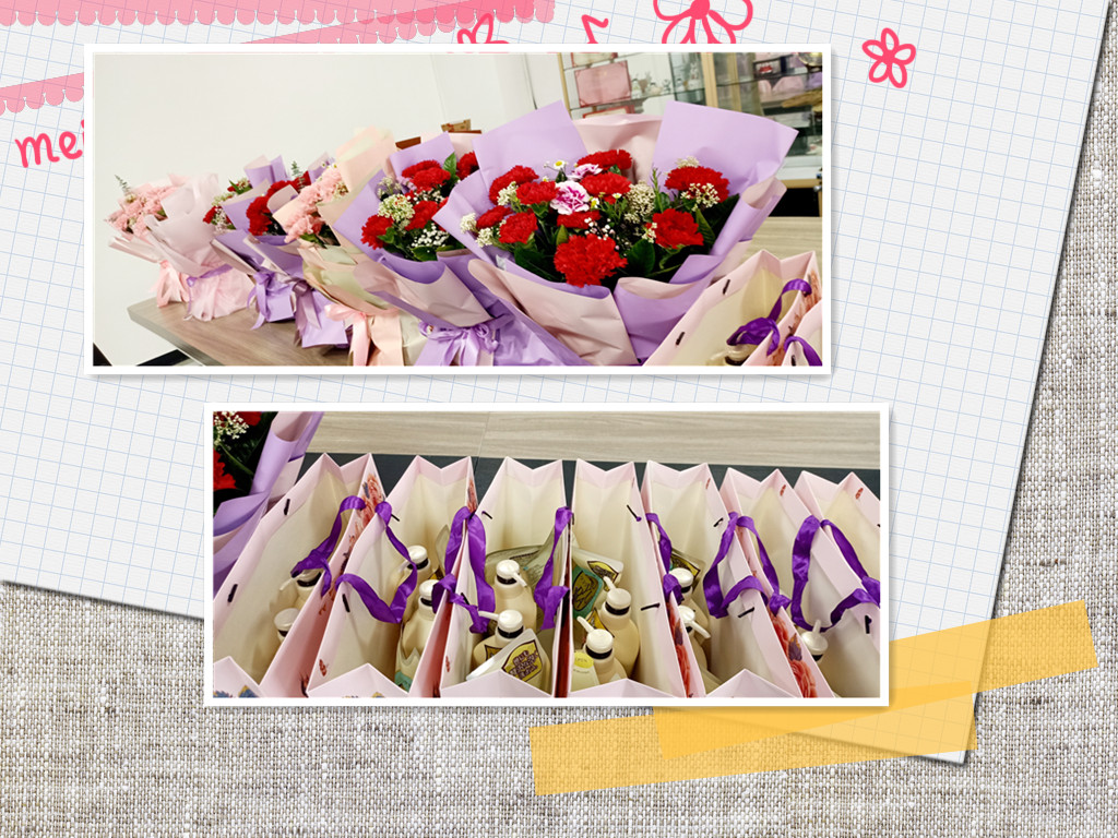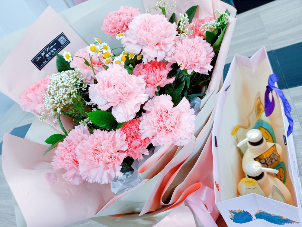 花語雖無聲,但此時無聲勝有聲。一簇簇康乃馨色澤明亮,嬌艷動人。有紅色的,有粉色的。紅色的高貴典雅,氣質(zhì)出眾;粉色的青澀甜美,讓人怦然心動,是種初戀的感覺。每一簇鮮花都是用平滑單色的巴黎紙包扎,再系上一支粉色的蝴蝶結,更顯得優(yōu)雅動人。再看看禮物袋子里面裝了什么,哇,乳白色包裝的沐浴露,不同味道的四個單品,公司實在是太貼心了。